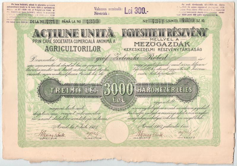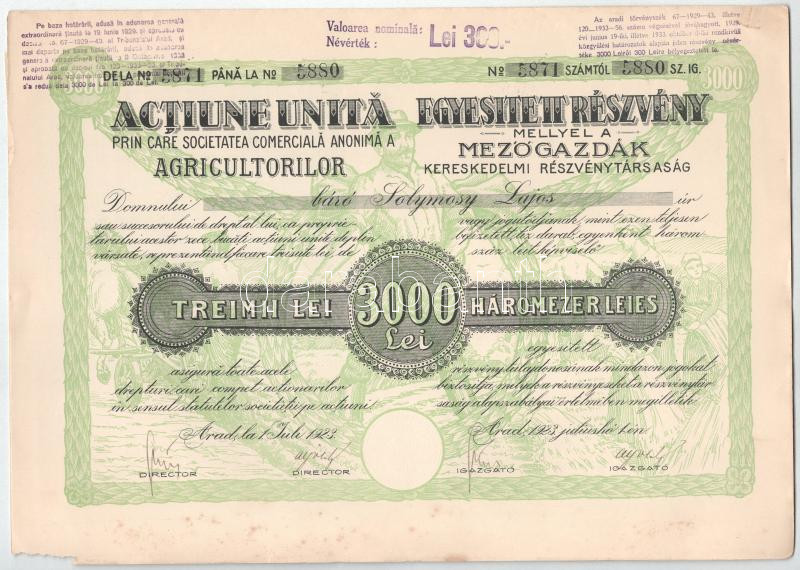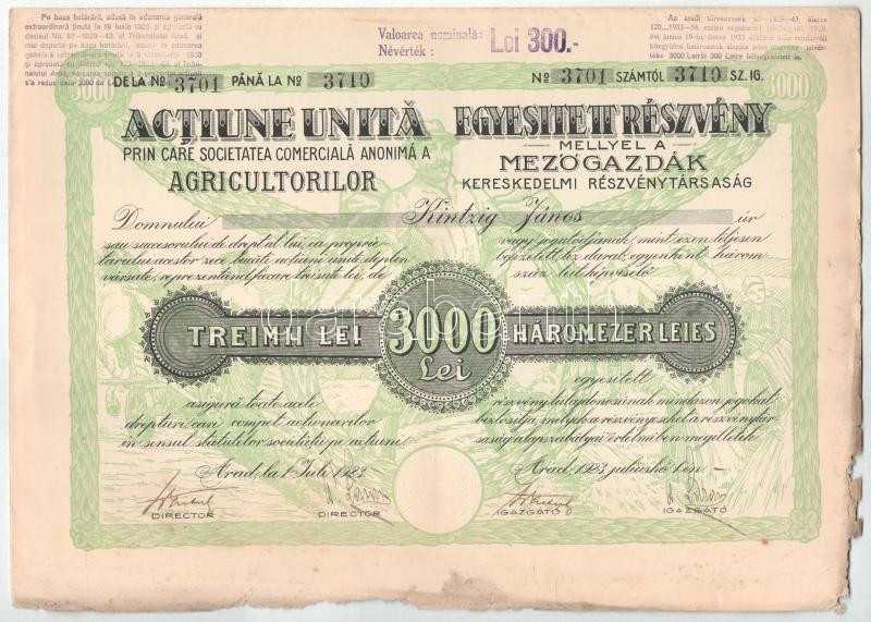 Románia 1923. Arad "Mezőgazdák Kereskedelmi Részvénytársaság" 10 részvénye egyben, összesen 3000L értékben, szárazpecséttel és szelvényekkel (5x, benne 2db sorszámkövető) T:VF hajtatlan, de foltok, beszakadások, egyiken nagyobb sarokhajlás