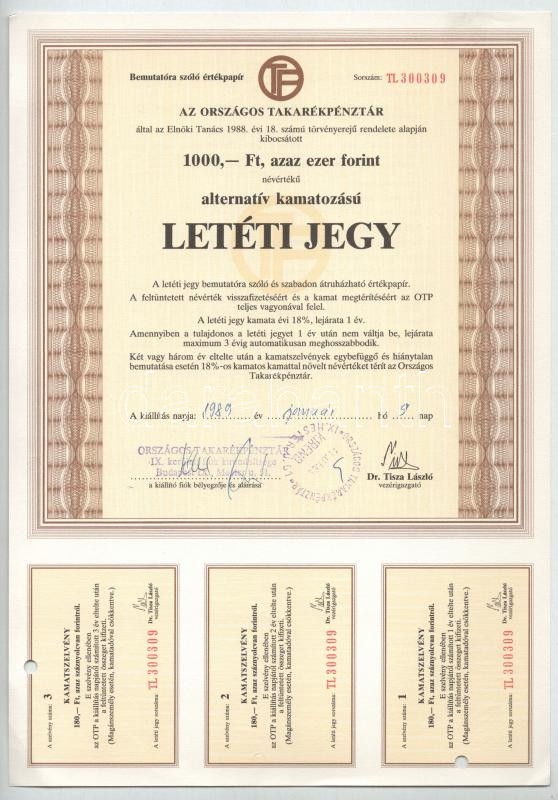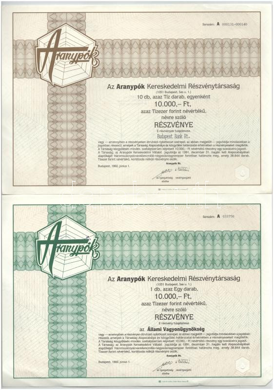 Description: Vegyes 8db-os részvény és értékpapír tétel, benne: Gönc és Vidéke Szövetkezeti Takarékpénztár részvényei 5000 és 50.000Ft-os névértékekben, Aranypók (2x) és Országos Takarékpénztár (OTP) letéti jegyei 1000 és 10.000Ft-os névértékek, az 1000Ft-os sorszámkövető párban. T:vegyes
