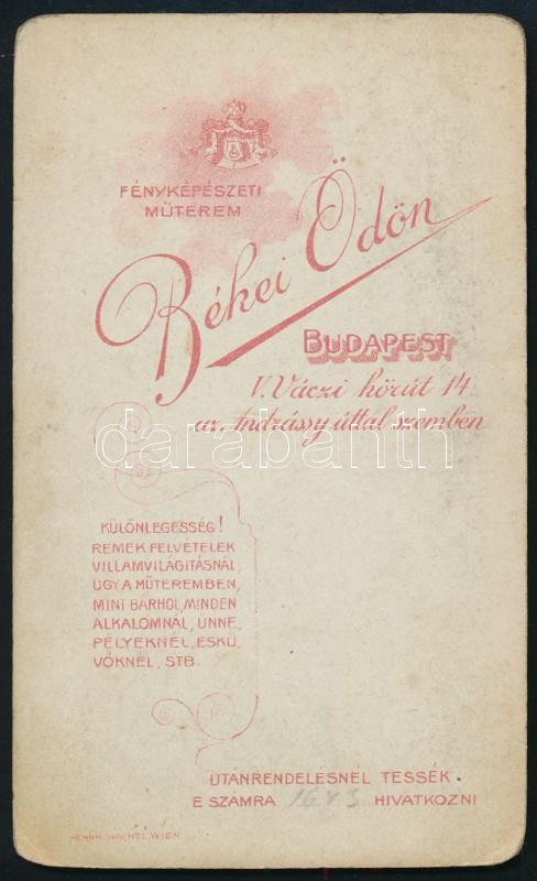 cca 1900 Elegáns, kalapot viselő hölgy portréja, vizitkártya Békei Ödö...