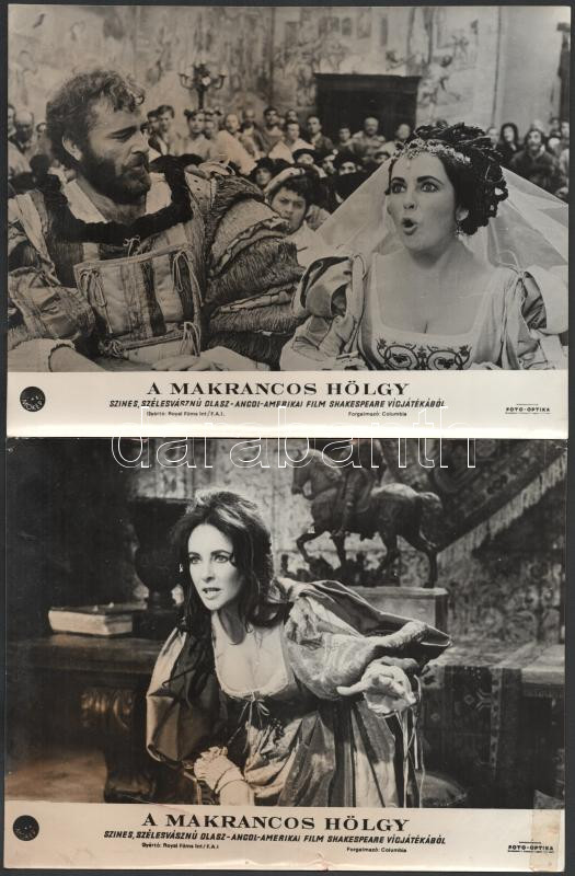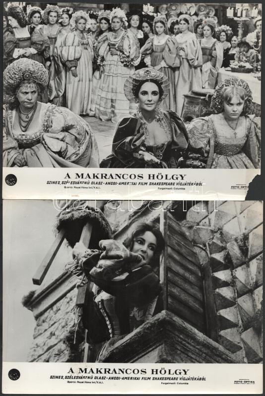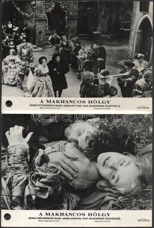 Description: cca 1989 előtt készült, "A makrancos hölgy" című olasz - angol - amerikai film jelenetei és szereplői, 9 db vintage produkciós filmfotó (vitrinfotó, lobbyfotó) ezüst zselatinos fotópapíron, a használatból eredő (esetleges) kisebb hibákkal, az egyik szövegmező sarka hiányos, 18x24 cm