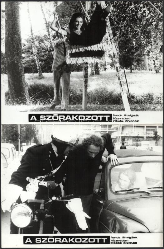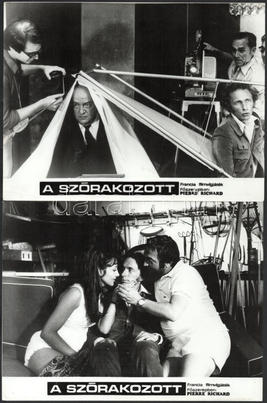 Description: cca 1989 előtt készült, "A szórakozott" című francia film jelenetei és szereplői, 31 db vintage produkciós filmfotó (vitrinfotó, lobbyfotó) ezüst zselatinos fotópapíron, a használatból eredő (esetleges) kisebb hibákkal, 18x24 cm