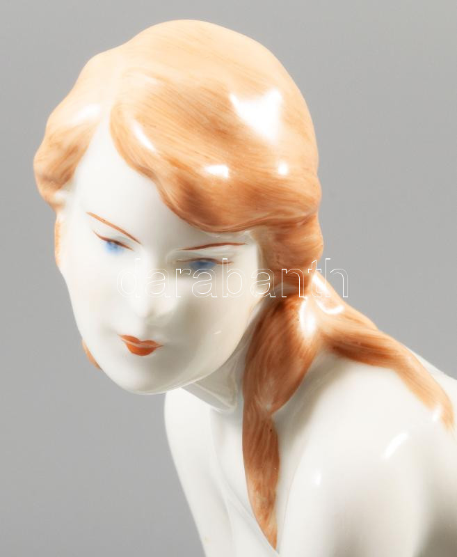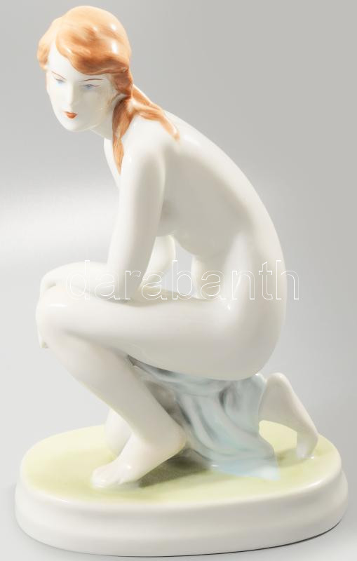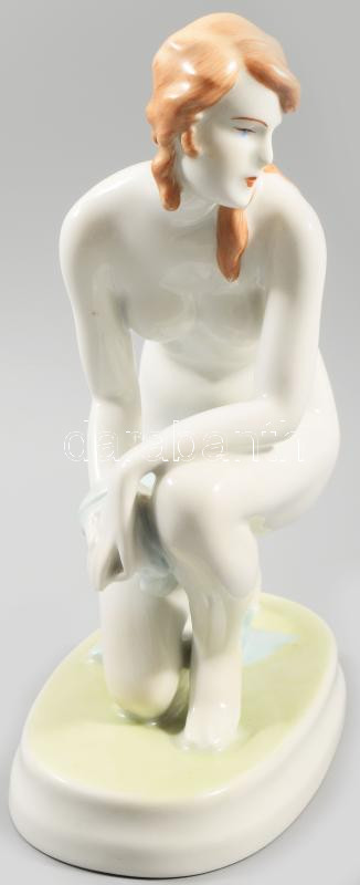 Zsolnay térdelő akt, kézzel festett, jelzett, hibátlan, m: 22,5 cm