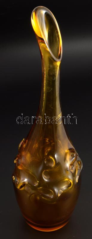 Anyagában borostyánszínű plasztikus díszítésű szakított üveg váza, m. 38 cm