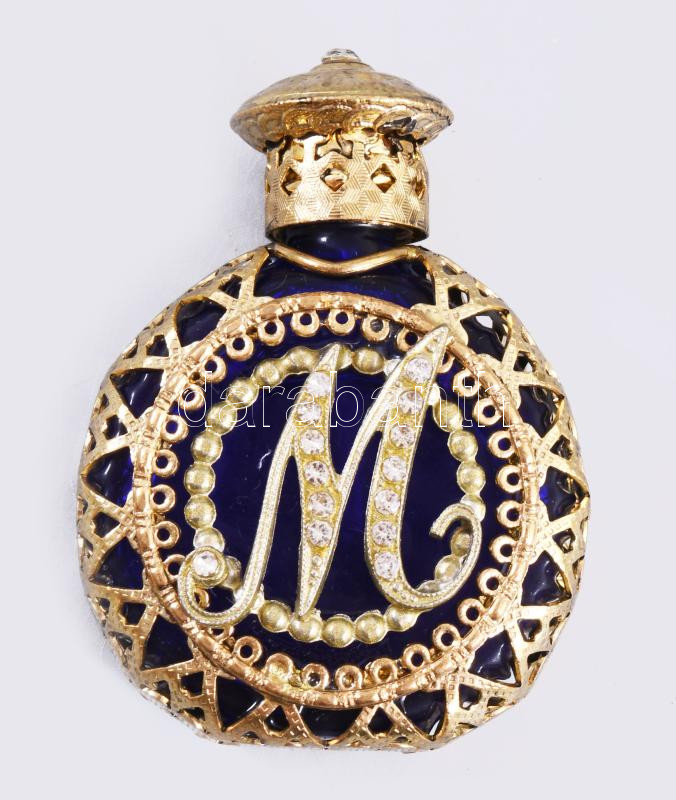 Királykék parfümös üveg, fém szerelékkel, m: 6,5 cm