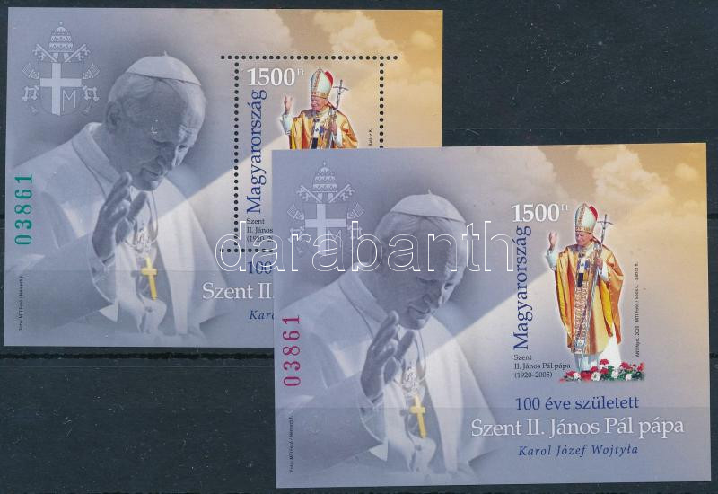 2020 100 éve született II. János Pál Pápa túlfogazott + vágott blokk azonos (03861) sorszámmal (21.500)