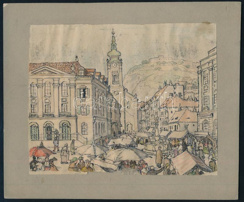 Jelzés nélkül: Piaci forgatag Budán, háttérben a Citadellával. Akvarell, tus, papír, alján sérült, kartonra kasírozva, 13,5x17 cm