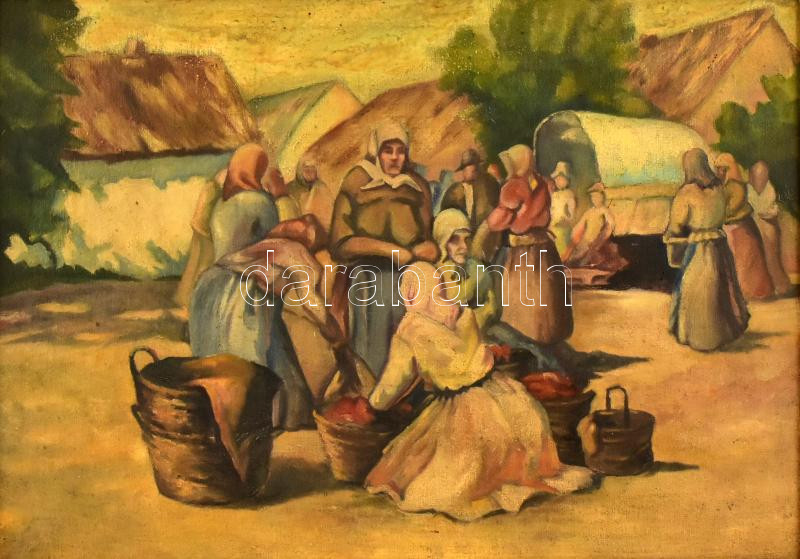 Jelzés nélkül, feltehetően a XX. sz. első felében működött magyar festő alkotása: Piaci forgatag. Olaj, vászon. Kissé sérült dekoratív fakeretben. 44x60,5 cm