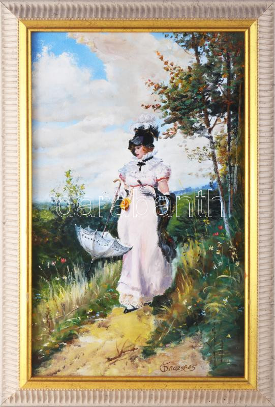 Olvashatatlan jelzéssel, feltehetően orosz festő: Hölgy napernyővel. Olaj, vászon. Dekoratív fakeretben. 40×25 cm