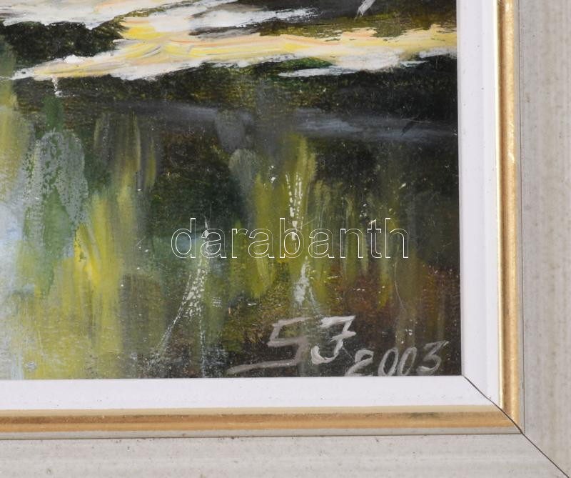 SJ jelzéssel: Vízparti táj. Olaj, farost. Dekoratív fakeretben. 29×37 ...