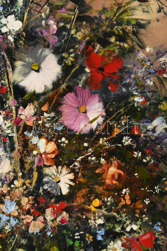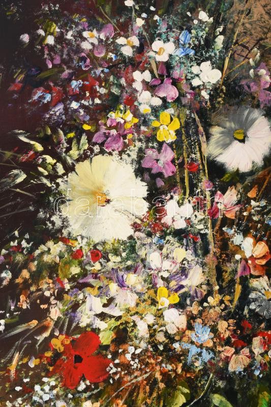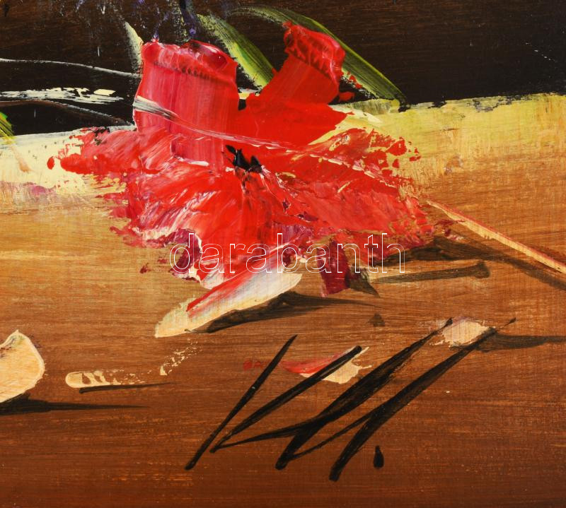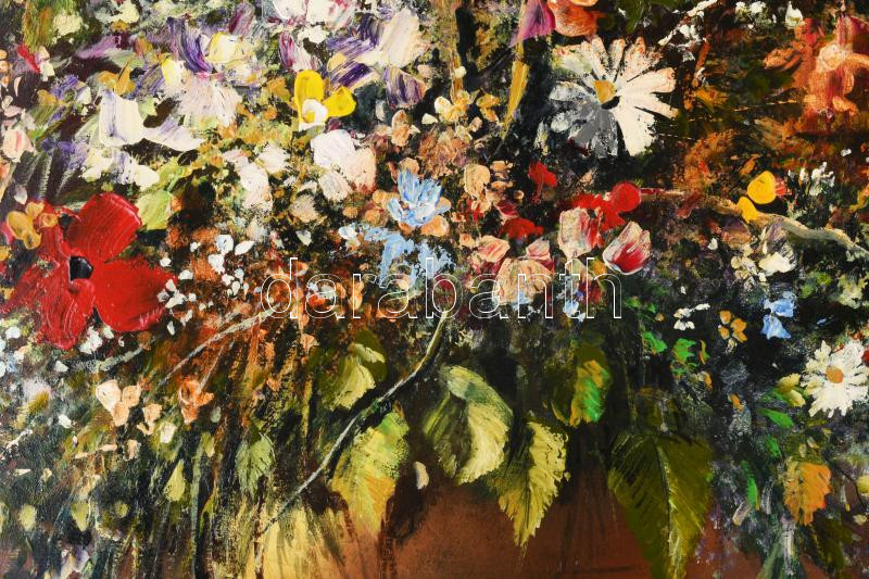 Adilov Kabul (1959-): Virágcsokor. Olaj, farost, jelzett, hátoldalán Art Studio Galéria címkéjével, dekoratív fakeretben, 80×60 cm