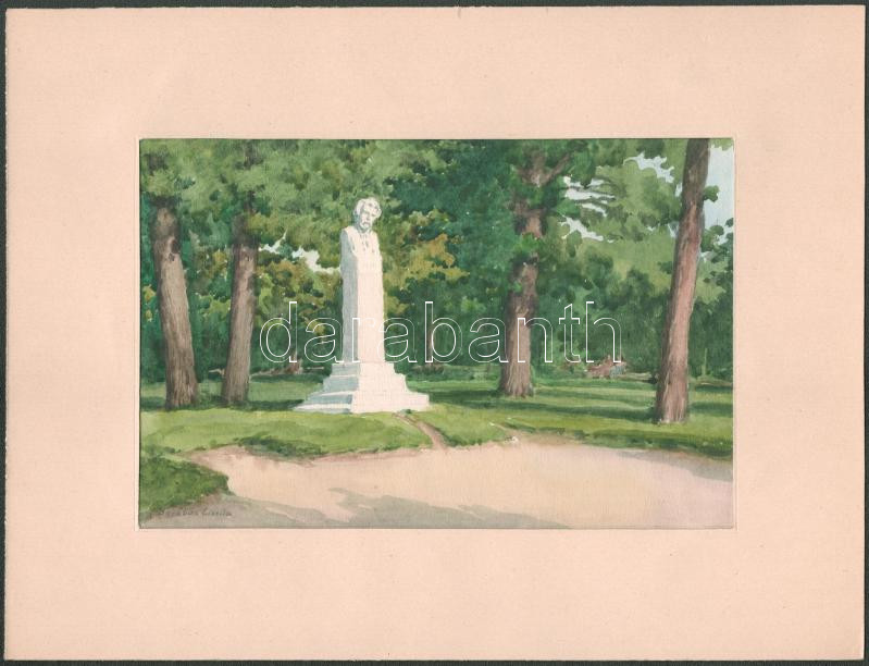 Barabás Reismann Gizella (1893-1985): Arany János szobra a Margitszigeten. Akvarell, papír, jelzett, hátoldalán Barabás Reismann Gizella autográf soraival. Paszpartuban. 13×20 cm