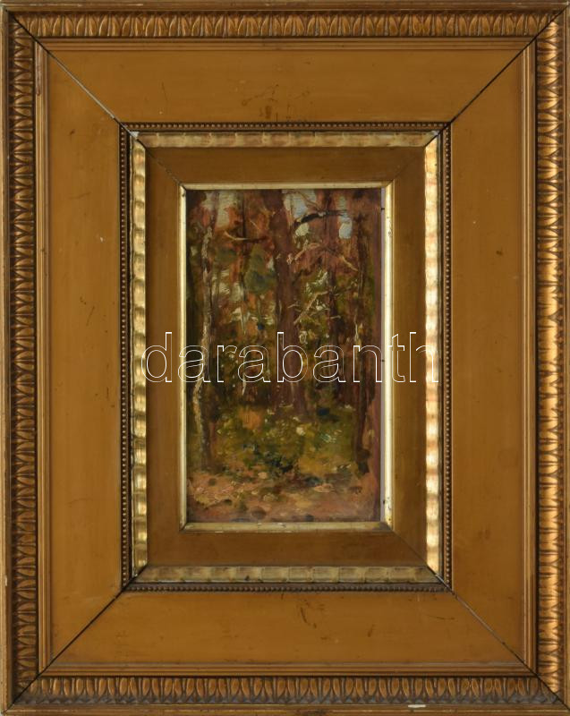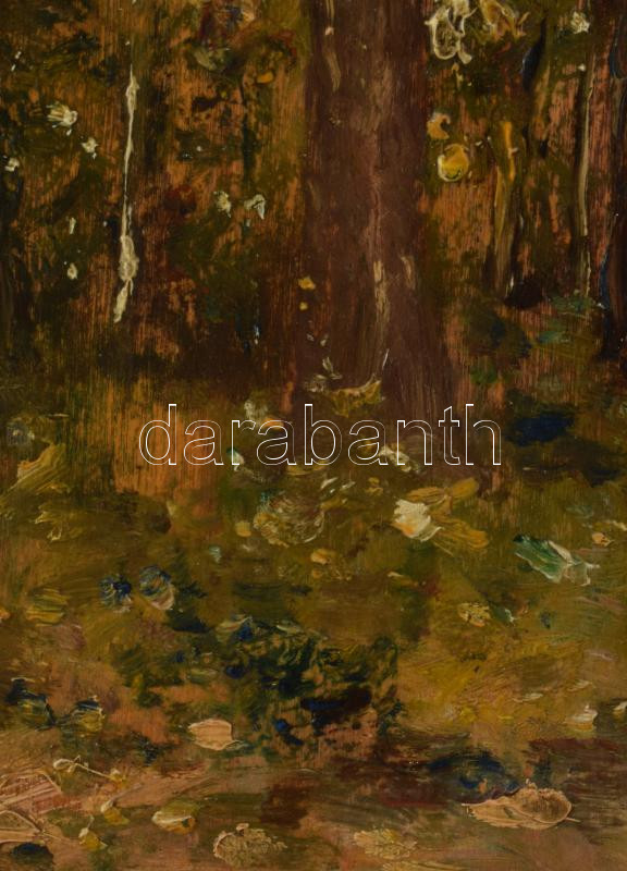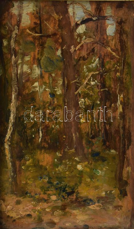 Bruck Lajos (1846-1910): Erdőrészlet. Olaj, fa, hátoldalon "Bruck Lajos hagyatéka" raglappal és árverési vagy kiállítási számmal, 16,5x10 cm