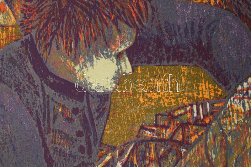 Fekete Esteban (1924-2009): Halász kutyával. Színes fametszet, papír, ...