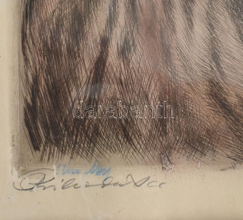Description: Glatz Oszkár (1872-1958) - Prihoda István (1891-1956): Betűvetés. Színezett rézkarc, papír. Glatz és Prihoda által jelzett. Lap széle kissé sérült. Üvegezett, dekoratív, kissé szúrágta fakeretben. 35x26 cm.