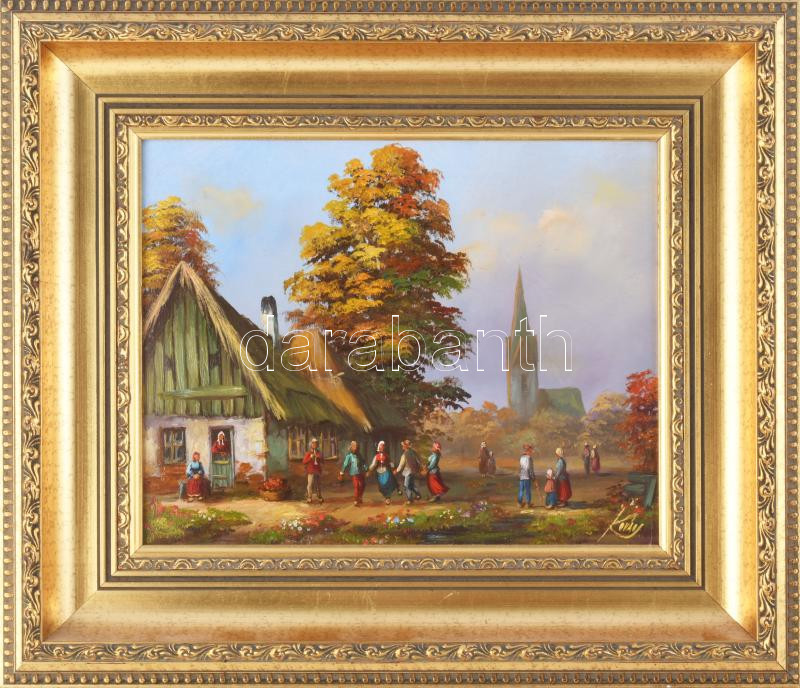 Kovács József (1948-): Táncoló társaság. Olaj, farost, jelzett, dekoratív fakeretben, 23,5x29,5 cm