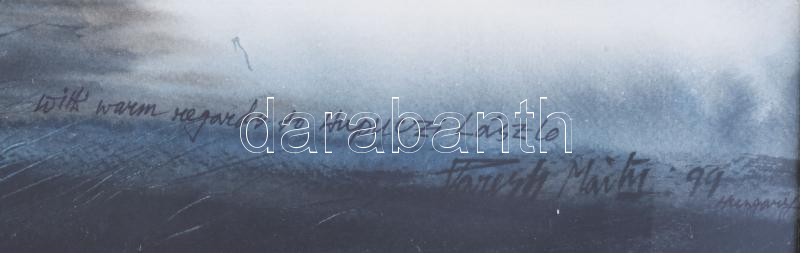 Paresh Maity (1965-), indiai festő: Felhős táj. Akvarell, papír, jelzett. Paresh Maity autográf ajándékozási soraival. Üvegezett, dekoratív, kopott fakeretben. 50x70 cm