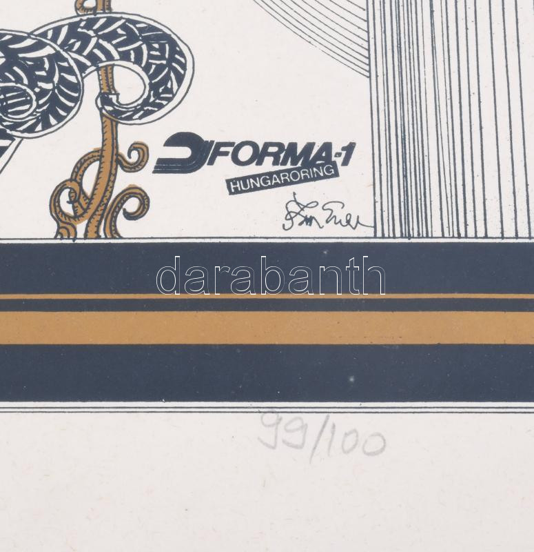Description: Szász Endre (1926-2003): A szárnyas isten. Szitanyomat, papír, jelzett, számozott (99/100), Forma 1 Hungaroring nyomtatott jelzéssel, üvegezett fakeretben. 37x57 cm