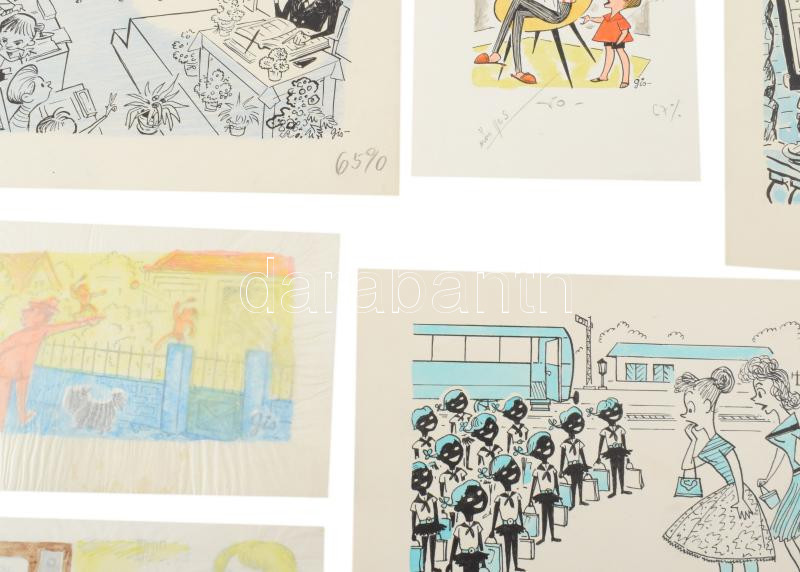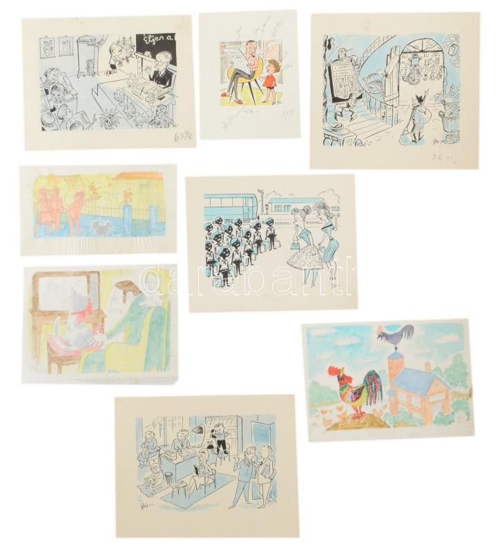 Description: Szegő Gizi (1902-1985): 8 db karikatúra. Vegyes technika, papír, jelzett, mindegyik hátoldalán "Ludas Matyi Szerkesztősége"bélyegzővel. 15x12 és 18x21 cm közötti méretekben