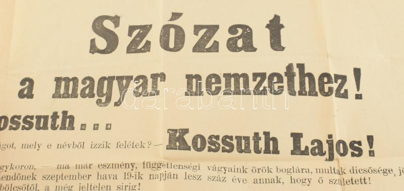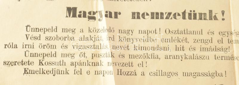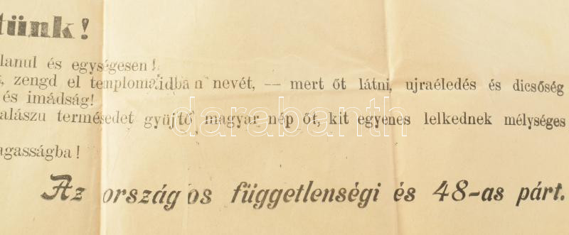 1902 ,,Szózat a magyar nemzethez!", az Országos Függetlenségi és 48-as Párt politikai plakátja, Bp., Független Magyarország R.T.-ny., sérült, szakadásokkal, kisebb hiányokkal, 63x47 cm