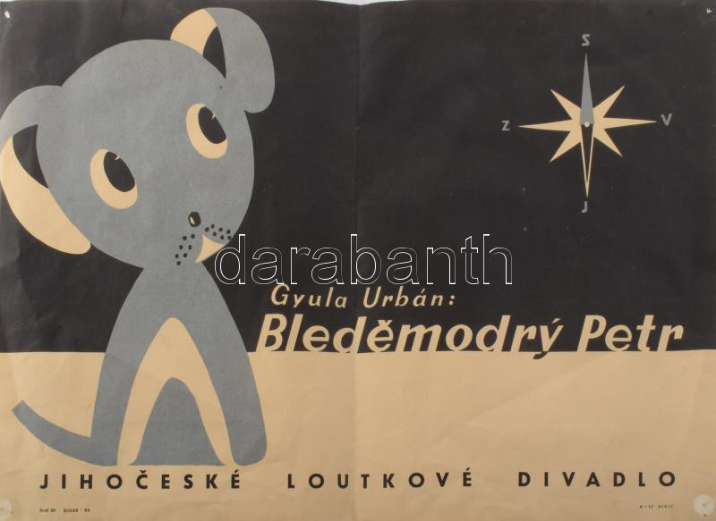 1964 Gyula Urbán: Bleděmodrý Petr, Urbán Gyula Hupikék Péter c. bábelőadásának cseh nyelvű plakátja, hajtva, sarkain apró lyukakkal, 29,5x41,5 cm