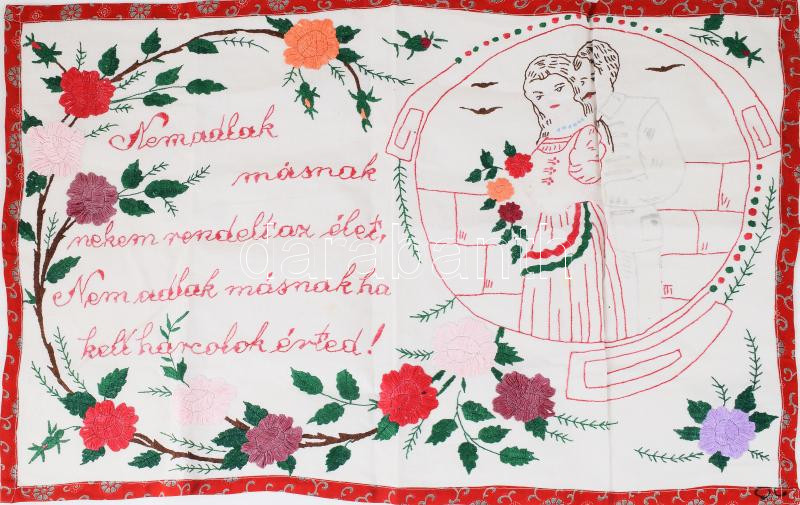 Kézzel hímzett konyhai falvédő, "Nem adlak másnak, nekem rendelt az élet, nem adlak másnak, ha kell, harcolok érted!" felirattal, 47x73 cm