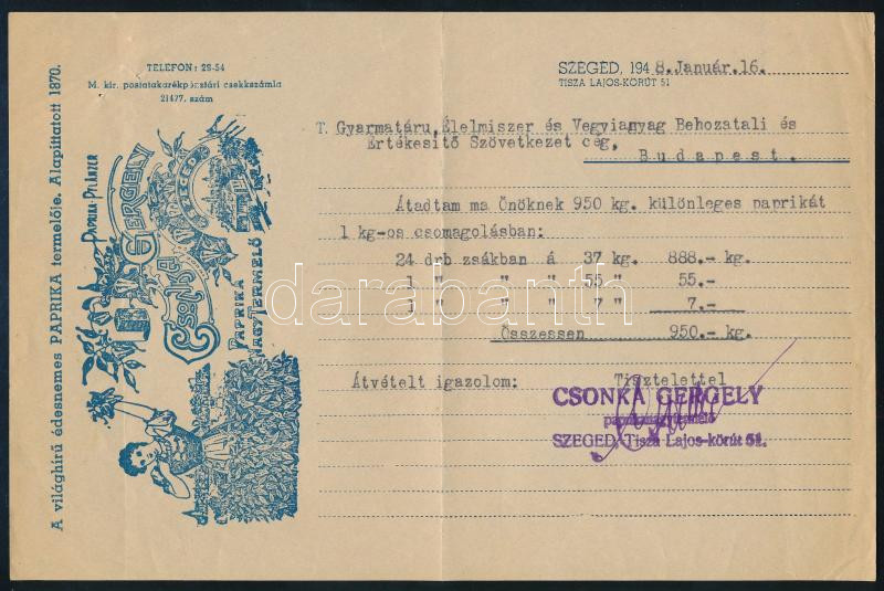 1948 Szeged, Csonka Gergely paprikanagytermelő fejléces számlája