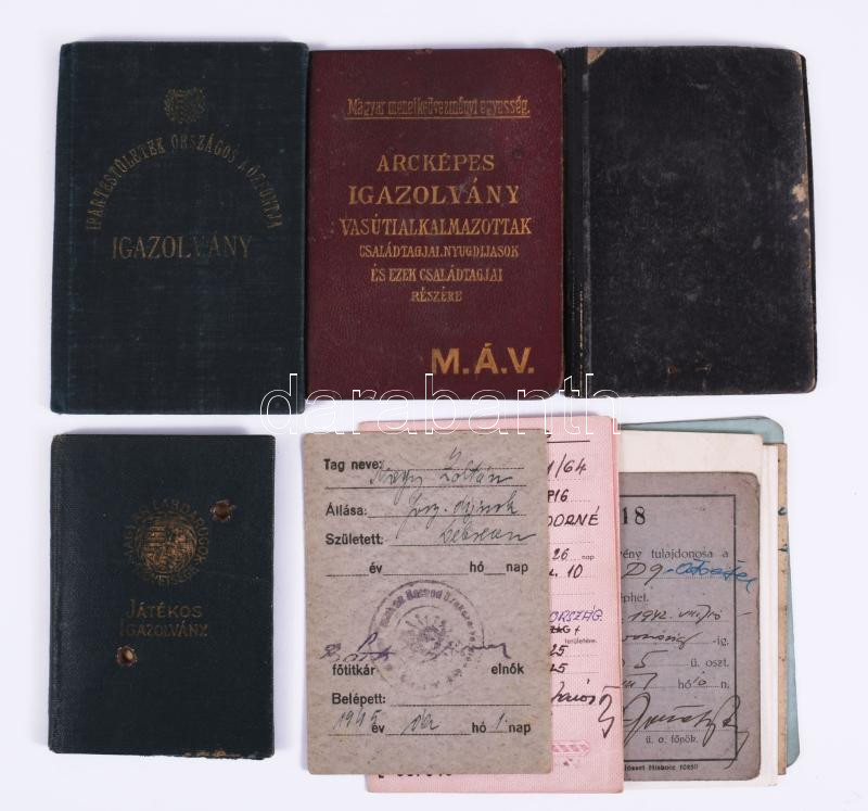 Description: Vegyes okmány tétel, közte MLSZ játékos-igazolvány, M. kir. 104. honv. légvédelmi tüzérosztály szolgálati jegy, Ipartestületek Országos Központja igazolvány, stb., összesen 12 db