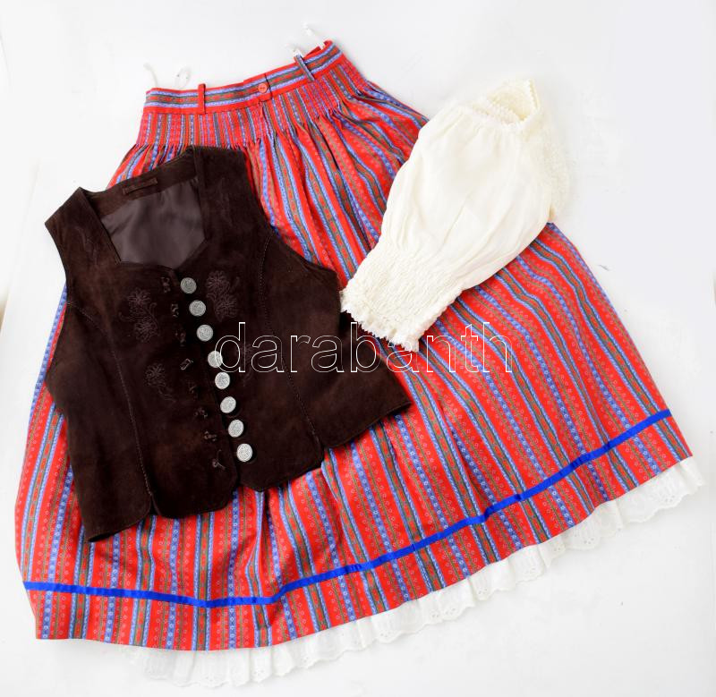 Bajor v osztrák sportalm ruha: szoknya és ing és bőr mellény