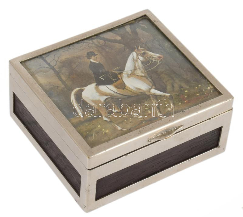 Régebbi díszdoboz, kopott nikkelezett réz szerelékkel, részben kézzel festett lovas képpel a fedelén, 8,5x9,5 cm