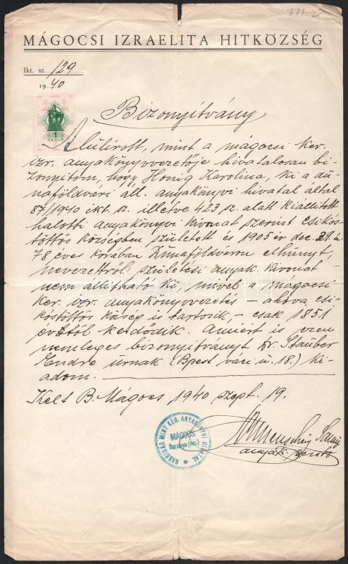 1940 Mágocs, az Izraelita Hitközség bizonyítványa, rajta az anyakönyvv...
