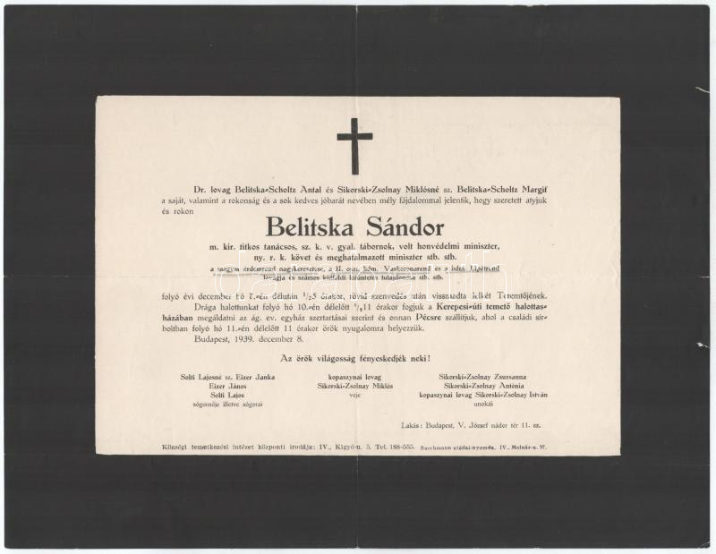 Description: 1939 Bp., Belitska Sándor (1872-1939) m kir. titkos tanácsos, gyalogsági tábornok, honvédelmi miniszter halotti értesítője, apró lapszéli sérülésekkel, 23x30 cm