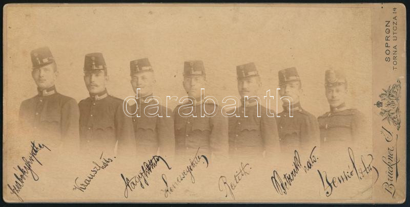 cca 1895 Hadapród-tiszthelyettesek csoportképe, a képen aláírásaikkal (Szabóky, Krausz, Kenessey, stb.), kabinetfotó Brückner Ignác soproni műterméből, 10,5x21 cm