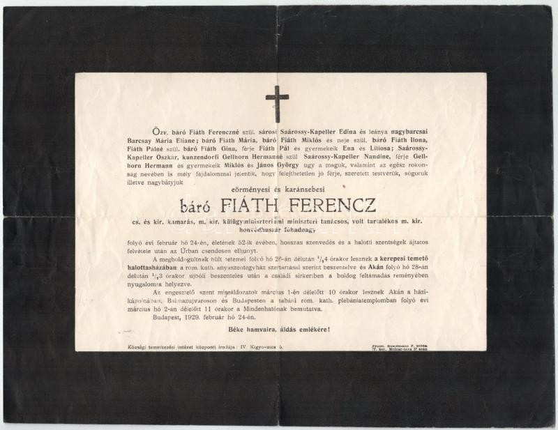 1929 Bp., Eörményesi és karánsebesi Báró Fiáth Ferenc cs. és kir. kamarás halotti értesítője, hajtott