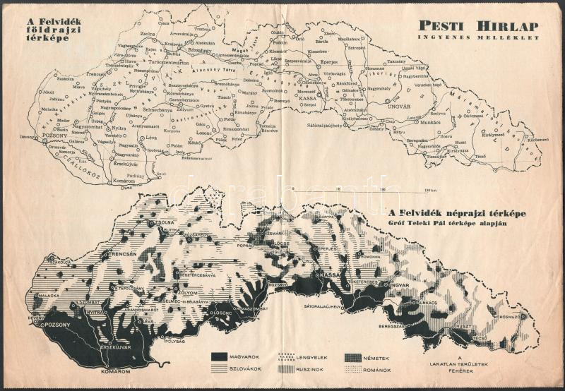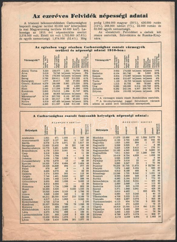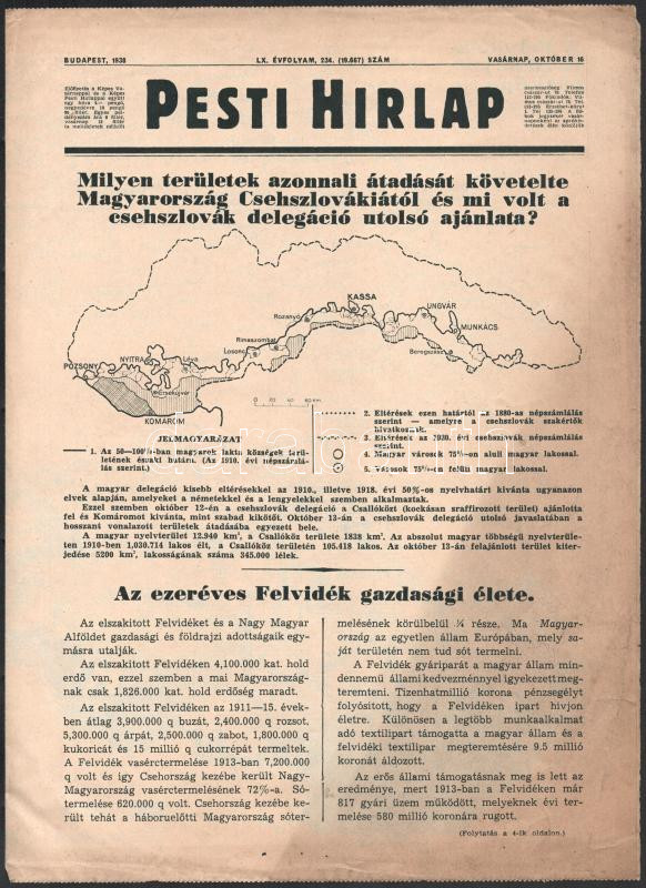 Description: 1938 A Pesti Hírlap 1938. október 16-i száma, a címlapon: ,,Milyen területek azonnali átadását követelte Magyarország Csehszlovákiától és mi volt a csehszlovák delegáció utolsó ajánlata?", a Felvidékkel kapcsolatos térképekkel és adatokkal az első bécsi döntést megelőzően, kisebb lapszéli szakadással, 4 p.