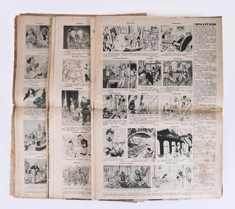 Description: 1941-1943 A Képes Vasárnap 10 db száma a II. világháború idejéből + A Magyar Szó I. évf. 23. száma, a címlapon: Riport egy ,,szétpofozott zsidó szerkesztőségről" [...], 4 p. Vegyes állapotban.