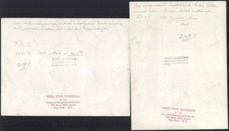 Description: cca 1945 Budapest ostroma után készült felvételek, szétlőtt épületek és adományért sorba álló emberek, 2 db a hátoldalon feliratozott, pecséttel jelzett sajtófotó, 24x18 cm