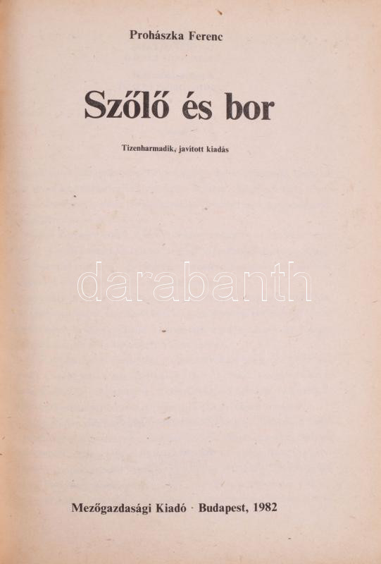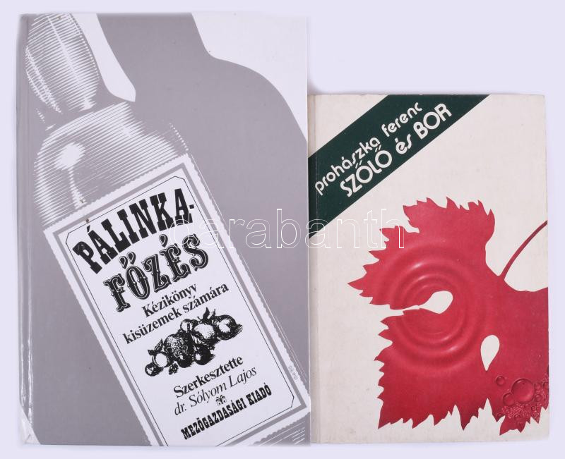 Description: Sólyom Lajos (szerk.): Pálinkafőzés. Kézikönyv kisüzemek számára. Bp., 1986, Mezőgazdasági Kiadó, 309+(3) p. Kiadói kartonált papírkötés. + Prohászka Ferenc: Szőlő és bor. Bp., 1982, Mezőgazdasági Kiadó, 353+(7) p. Kiadói papírkötés.