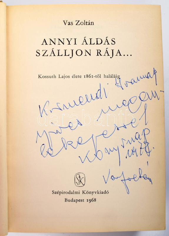 Vas Zoltán: Annyi áldás szálljon rája... Kossuth Lajos élete 1861-től ... https://www.darabanth.com/en/512-Online-auction/512.0/Books/Books-History~670/Vas-Zoltan-Annyi-aldas-szalljon-raja-Kossuth-Lajos-elete-1861-tol-halalaig-DEDIKALT-~II3438858