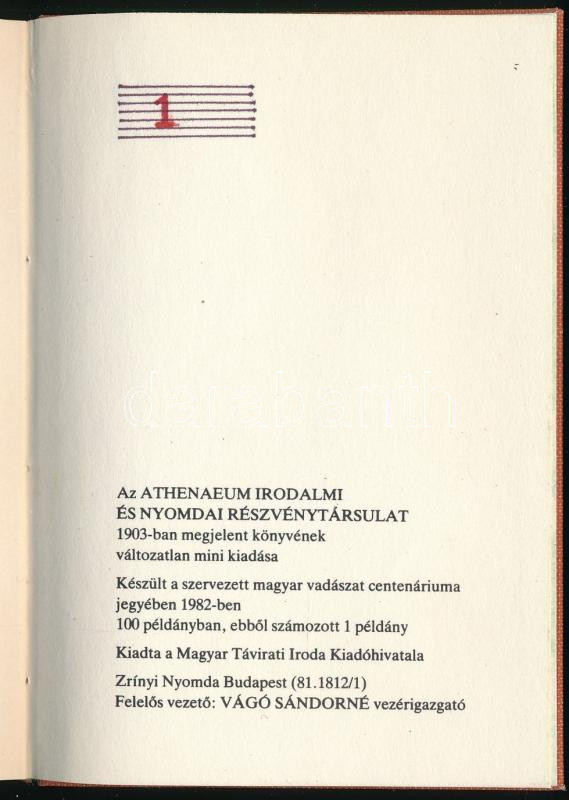 Description: Balkay Rudolf: A szarvas és vadászata. 27 színes rajzzal. Bp., 1982., MTI. Az 1903-ban, az Athenaeum által kiadott könyv minikönyv reprint kiadása. Kiadói egészvászon-kötés, 11,5x8 cm. "Megjelent 100 példányban, ebből számozott 1 példány."