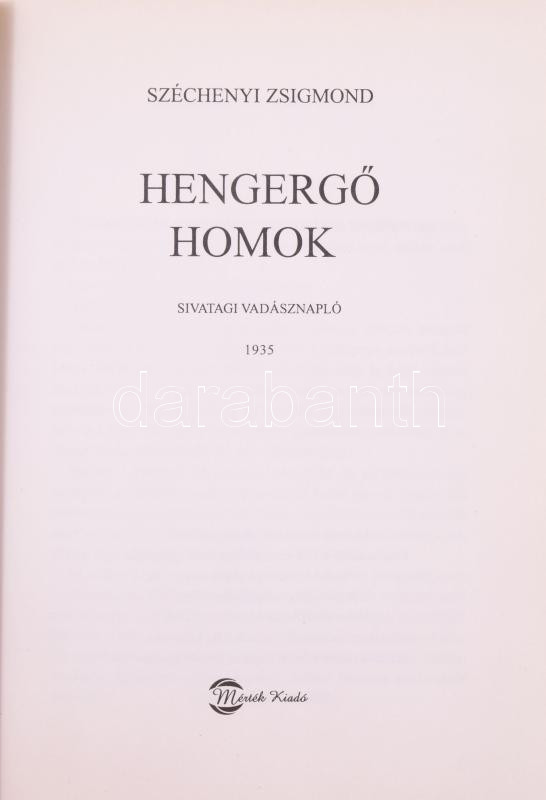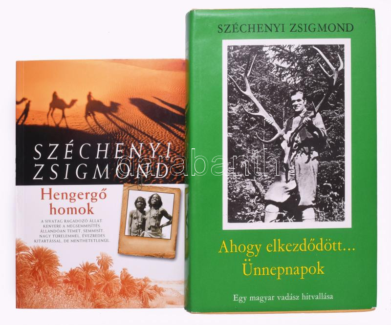 Széchenyi Zsigmond 2 kötete: Ahogy elkezdődött... Ünnepnapok. Egy magyar vadász hitvallása. Bp., 1978, Szépirodalmi Könyvkiadó. Kiadói egészvászon-kötés, kiadói papír védőborítóban. + Hengergő homok. Sivatagi vadásznapló 1935. Bp., 2012, M-érték. Kiadói papírkötés.