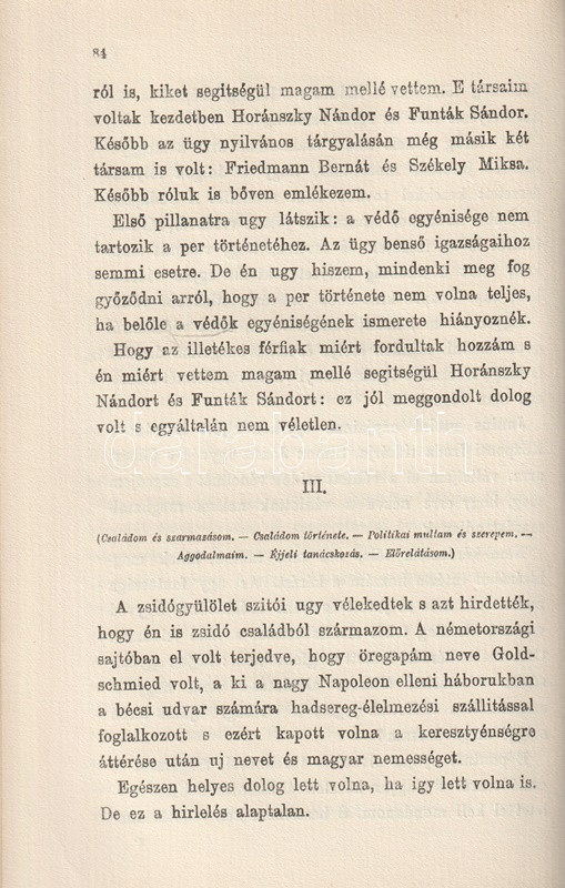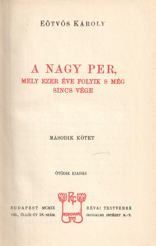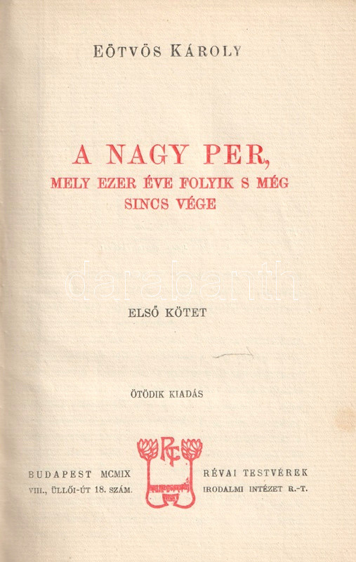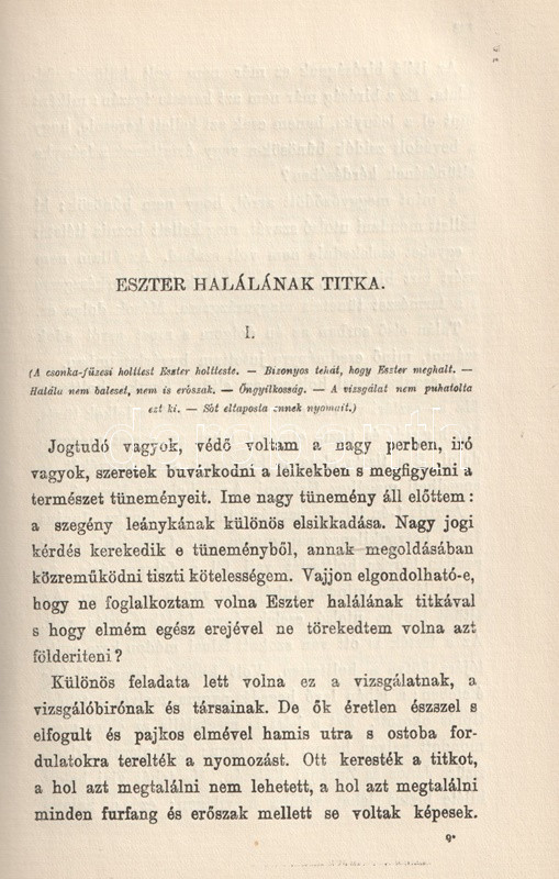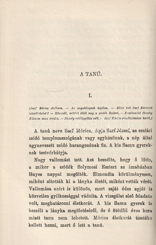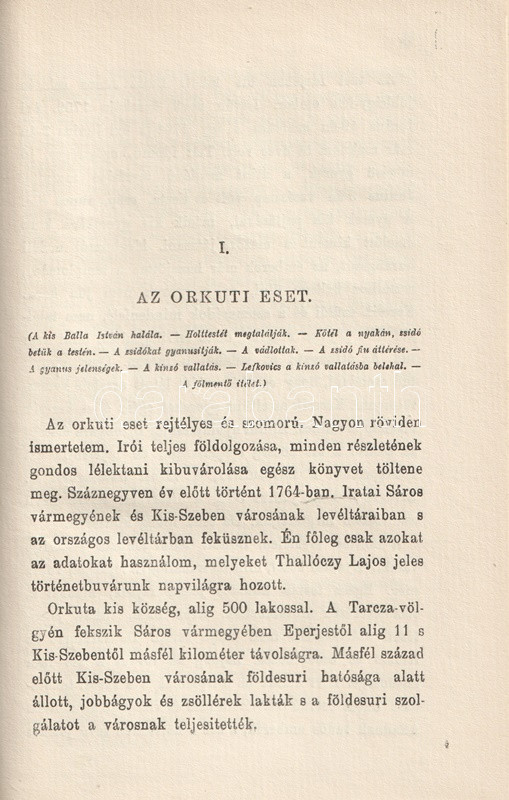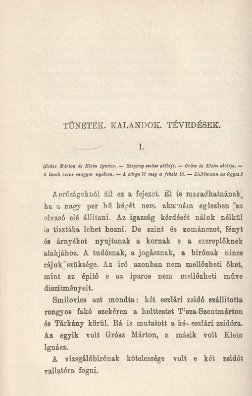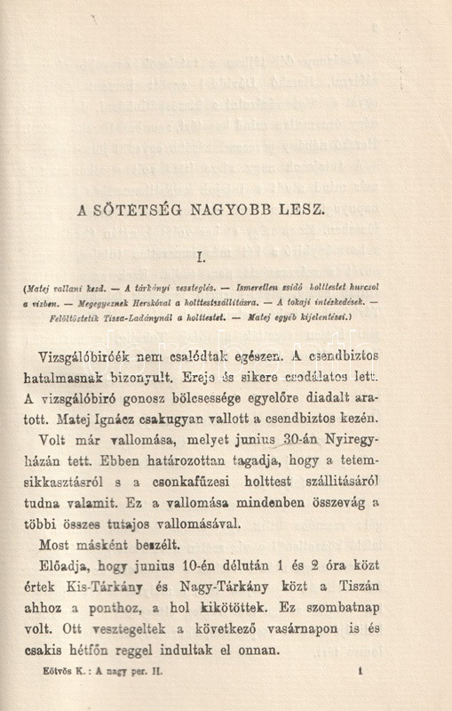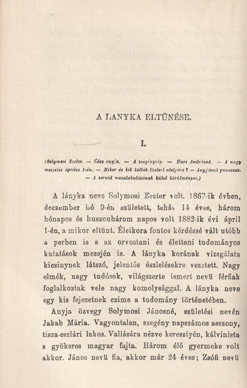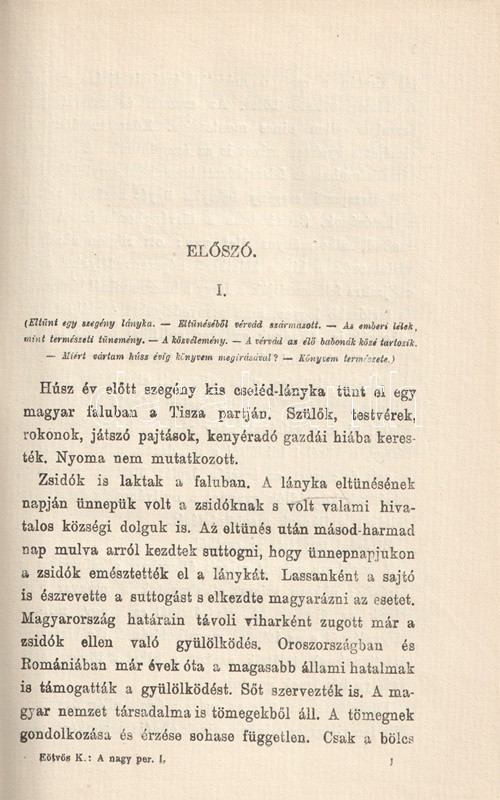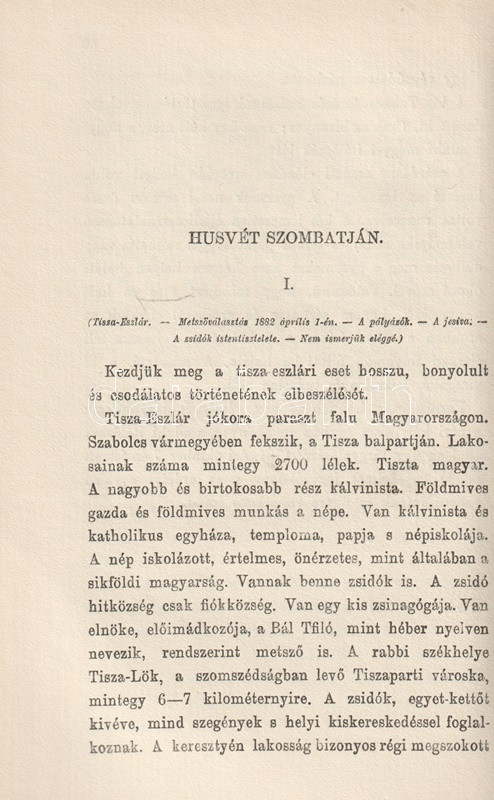 Eötvös Károly (1842-1916) függetlenségi párti politikus, ügyvéd, közíró, az ország legtekintélyesebb ügyvédje. Pályája meghatározó pontja az 1883. évi tiszaeszlári perben vállalt szerepe: a rituális gyilkosság elkövetésével megvádolt tiszaeszlári zsidóság védelmét ő biztosította. Az egész ország közvéleményét lázban tartó per Eötvös Károly nevezetes, többórás védőbeszédével végződött, melynek nyomán a vádlottakat felmentették. Az ügyvéd évtizedekkel később, írói pályája csúcsán írta meg a per társadalomtörténeti reflexiókban gazdag történetét. A mű első kiadása 1904-ben jelent meg, példányunk a munka ötödik kiadásából származik.