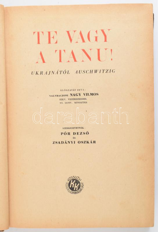 Te vagy a tanu! Ukrajnától Auschwitzig. Nagybaczoni Nagy Vilmos. Szerk.: Pór Dezső és Zsadányi Oszkár. Bp.,(1947), Kossuth, 482+3 p.+12 (képtáblák) t. Kiadói kissé kopott félvászon-kötésben.