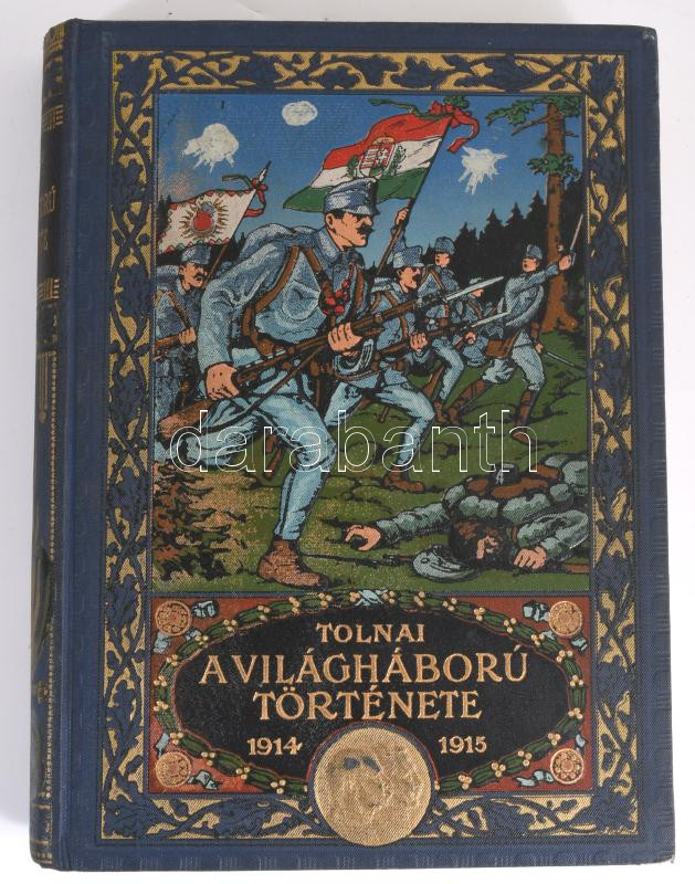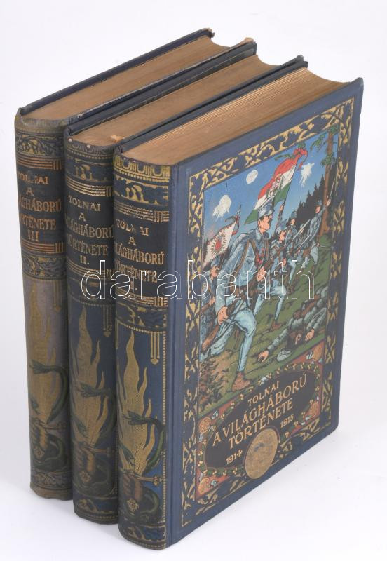 Tolnai: A világháború története 1914-1917. I-III. köt. Diplomáciai okiratok, hivatalos jelentések, szemtanúk hiteles följegyzései és eredeti adatok nyomán írta Zigány Árpád. Több száz képpel, eredeti fölvételekkel és térképekkel. A Tolnai Világlapja ajándéka. Bp.,én., Magyar Kereskedelmi Közlöny, (Tolnai -ny.), 448 p.; 398+2 p.; 399+1 p. Gazdag fekete-fehér képanyaggal illusztrált. Kiadói aranyozott, festett, illusztrált egészvászon-kötés, kopott borítókkal.