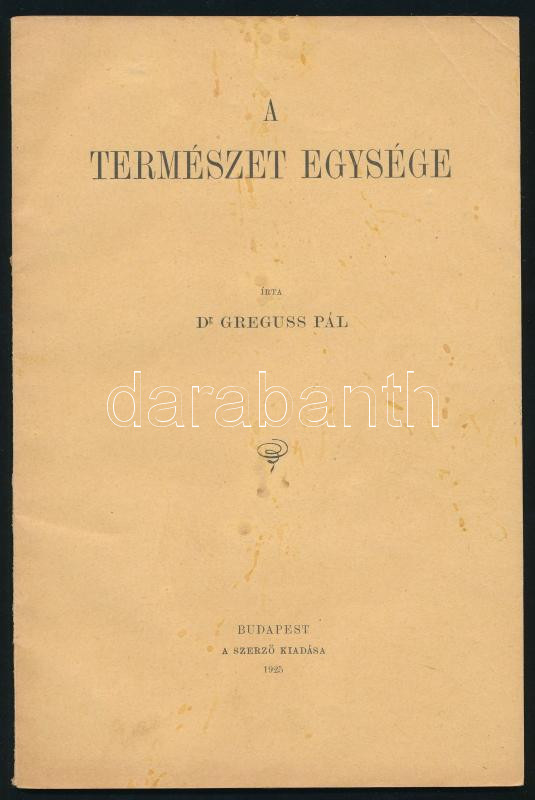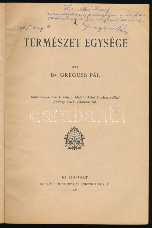 Greguss Pál: A természet egysége. Különlenyomat az Országos Polgári Iskolai Tanáregyesületi Közlönyv XXIX. évfolyamából. A szerző, Greguss Pál (1889-1984) botanikus, egyetemi tanár, a biológiai tudományok doktora által Tantó (Tanthó) József (1888-1973), Békés vármegye népművelési titkára részére dedikált példány. Bp., 1925, Stephaneum-ny., 67+(1) p. Kiadói papírkötés, kissé foltos borítóval.