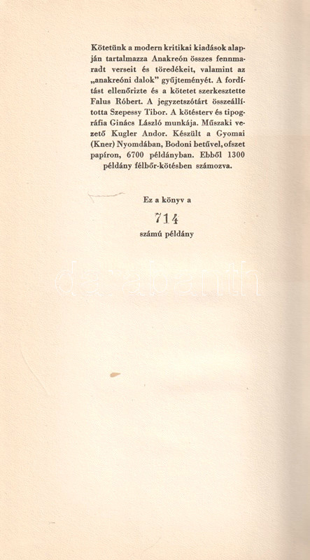 Könyvgyűjtők számára készült, számozott, bibliofil kiadás. Kolofon: "Kötetünk a modern kritikai kiadások alapján tartalmazza Anakreón összes fennmaradt verseit és töredékeit. A fordítást ellenőrizte és a kötetet szerkesztette Falus Róbert. A kötésterv és tipogáfia Ginács László munkája. Műszaki vezető Kugler Andor. Készült a Gyomai Kner Nyomdában, Bodoni betűvel, 6.700 pédányban, ebből 1.300 példány félbőr-kötésben, számozva. Ez a könyv a 714. számú példány".