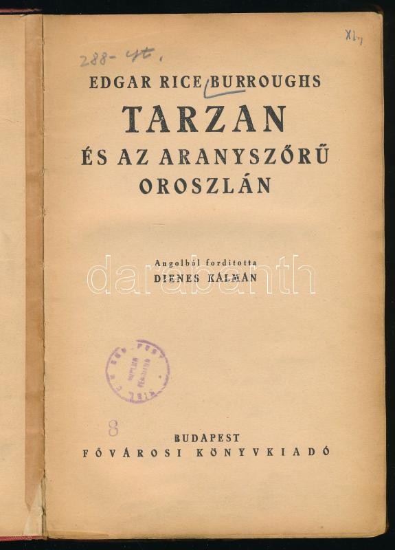 Burroughs, Edgar Rice: Tarzan és az aranyszőrű oroszlán. Ford.: Dienes Kálmán. Bp., [1925], Fővárosi Könyvkiadó, 245+(3) p. Első magyar kiadás. Átkötött félvászon-kötésben, az eredeti, Jaschik Álmos által illusztrált elülső papírborító bekötve, kissé viseltes borítóval, helyenként kissé sérült, foltos lapokkal.