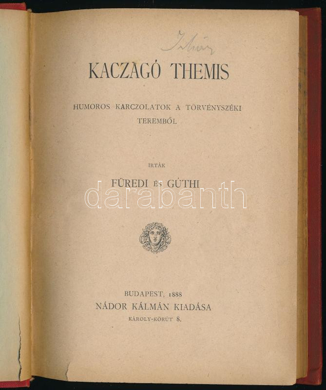 Füredi és Gúthi: Kaczagó Themis. Homoros karczolatok a törvényszéki teremből. Bp., 1888, Nádor Kálmán. Kiadói egészvászon kötés, kopottas állapotban.