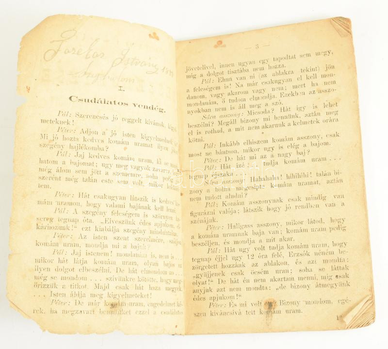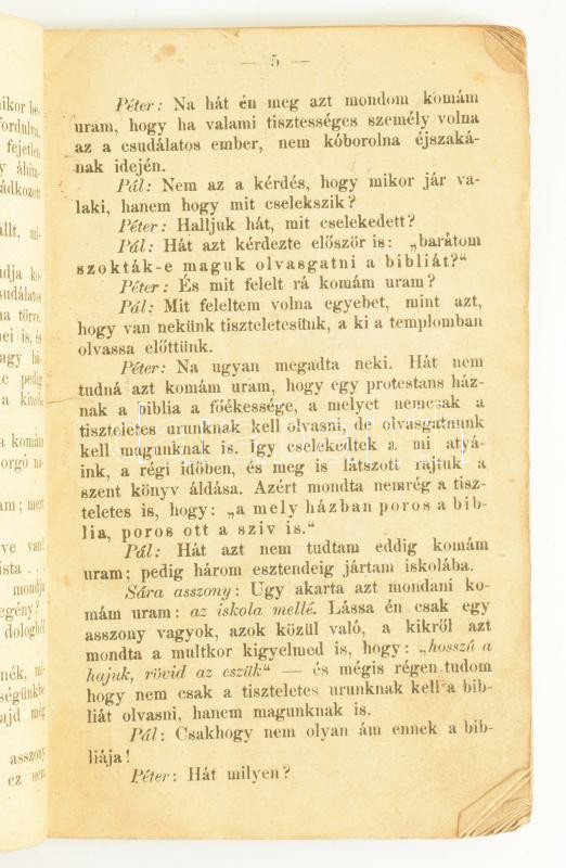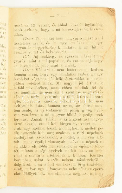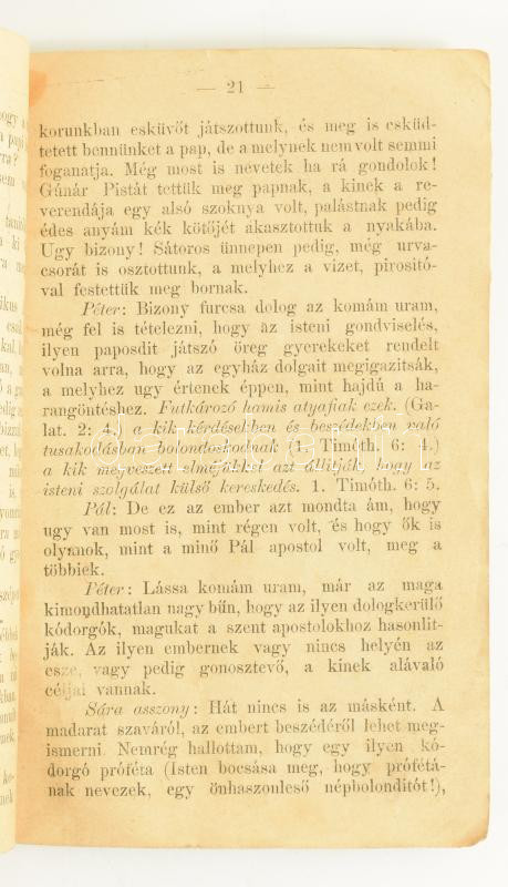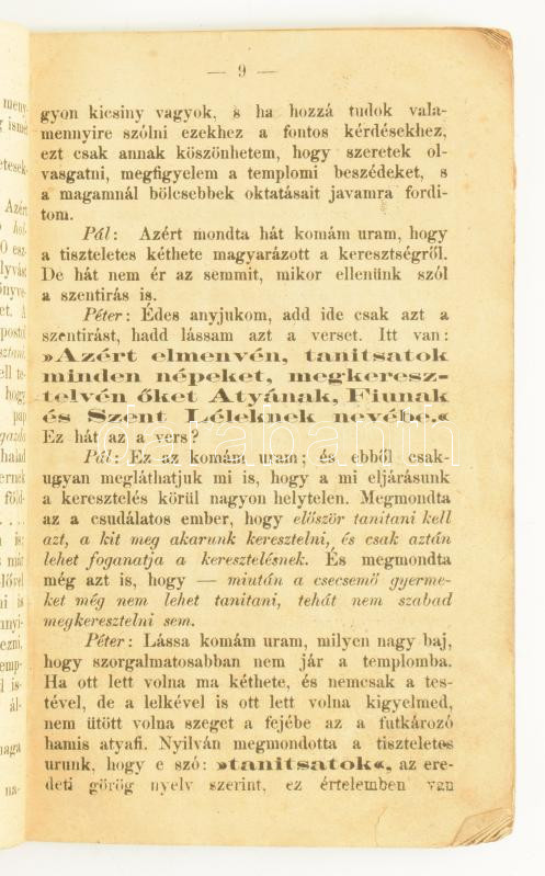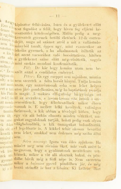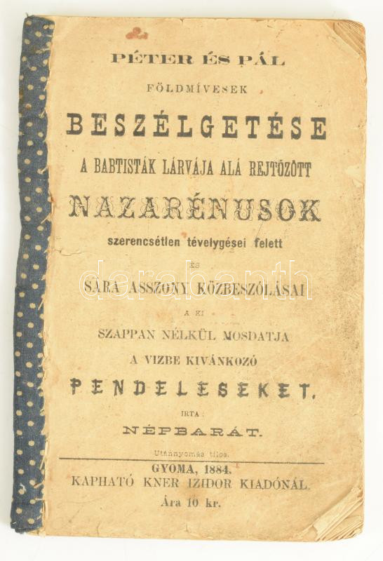 [Garzó Gyula] Népbarát: Péter és Pál földmívesek beszélgetése a babtisták lárvája alá rejtőzött nazarénusok szerencsétlen tévelygései felett és Sára asszony közbeszólásai a ki szappan nélkül mosdatja a vizbe kivánkozó pendeleseket. Írta --. Gyoma, 1884. Kner Izidor. 48 p. Fűzve, kötés nélkül, a gerincen vászon szalaggal,
