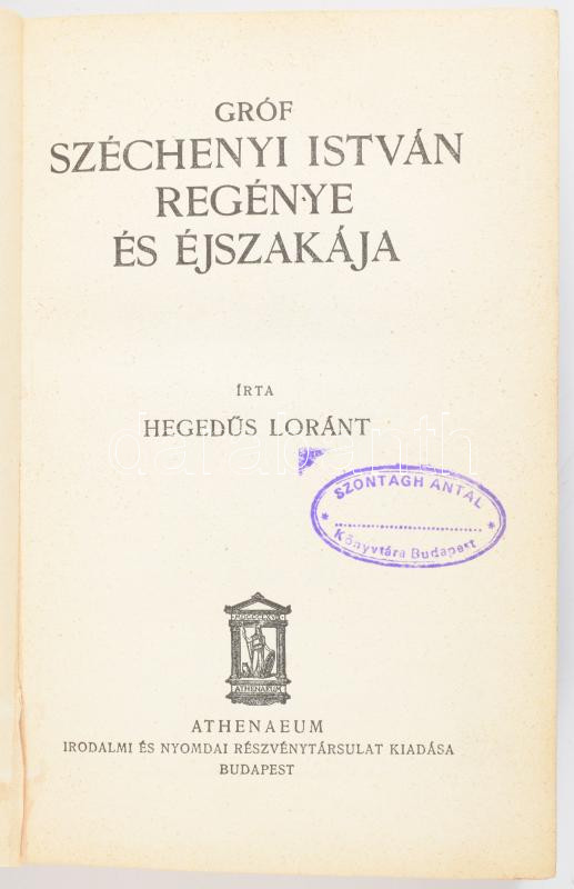 Hegedüs Loránt: Gróf Széchenyi István regénye és éjszakája. Bp., [1933... https://www.darabanth.com/en/512-Online-auction/512.0/Books/Books-Other-rarities~690/Hegedus-Lorant-Grof-Szechenyi-Istvan-regenye-es-ejszakaja-Bp-1933-Athenaeum-324plus4~II3464043