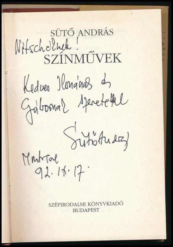 Description: Sütő András: Színművek. (Káin és Ábel. A szuzai menyegző. Az álomkommandó.) A szerző, Sütő András (1927-2006) Herder- és Kossuth-díjas erdélyi magyar író által dedikált példány. Bp., 1992, Szépirodalmi Könyvkiadó. Kiadói egészvászon-kötés, kiadói papír védőborítóban.